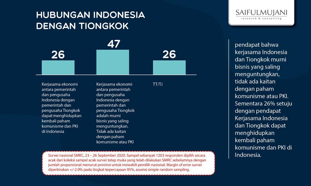 Survei Saiful Mujani Research and Consulting (SMRC) terbaru menunjukkan 47% warga menganggap kerjasama Indonesia dan RRC adalah murni bisnis yang saling menguntungkan, tidak ada kaitan dengan paham komunisme atau PKI.
