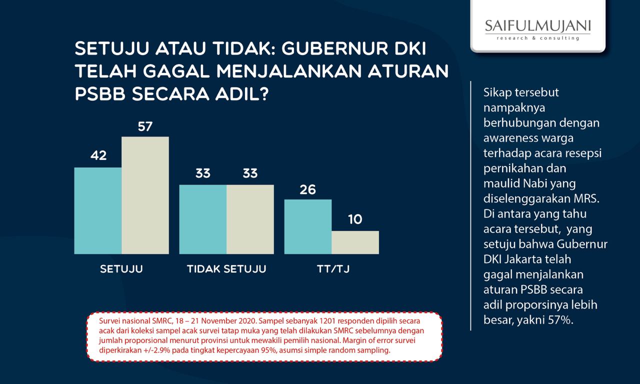 Survei nasional Saiful Mujani Research and Consulting (SMRC) menunjukkan sekitar 49% warga tahu adanya acara resepsi pernikahan dan Maulid Nabi yang diselenggarakan oleh MRS. “Di antara yang tahu acara tersebut, sekitar 57% setuju dengan pendapat bahwa Gubernur DKI Jakarta telah gagal menjalankan aturan PSBB secara adil kepada semua warga DKI Jakarta tanpa memandang etnis, agama atau golongannya,” ujar Abbas.