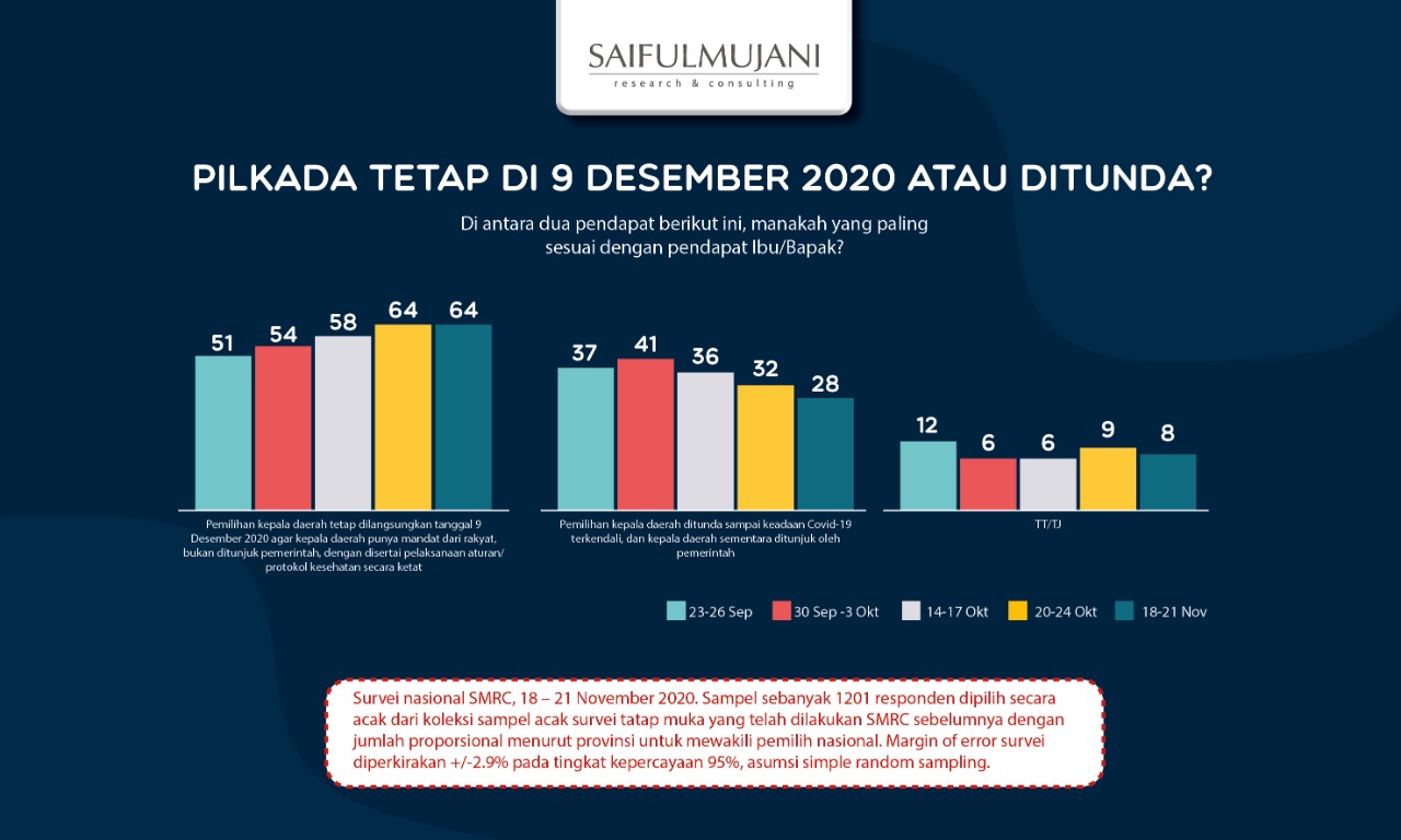 Survei nasional Saiful Mujani Research and Consulting (SMRC) menunjukkan 64% warga di Indonesia berharap Pemilihan Kepada Daerah serentak tetap dilangsungkan pada 9 Desember 2020 dengan protokol kesehatan ketat agar kepala daerah punya mandat dari rakyat. Hanya 28% yang menilai pemilihan daerah sebaiknya ditunda sampai keadaan Covid-19 terkendali dan kepala daerah ditunjuk oleh pemerintah.