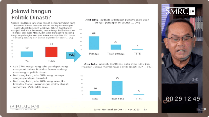 Demikian hasil survei yang dilakukan Saiful Mujani Research and Consulting (SMRC) pada 29 Oktober – 5 November 2023. Hasil survei ini disampaikan pendiri SMRC, Prof. Saiful Mujani, dalam program ‘Bedah Politik bersama Saiful Mujani’ episode “Sentimen Publik atas Dinasti Jokowi” di kanal Youtube SMRC TV pada Kamis, 16 November 2023.