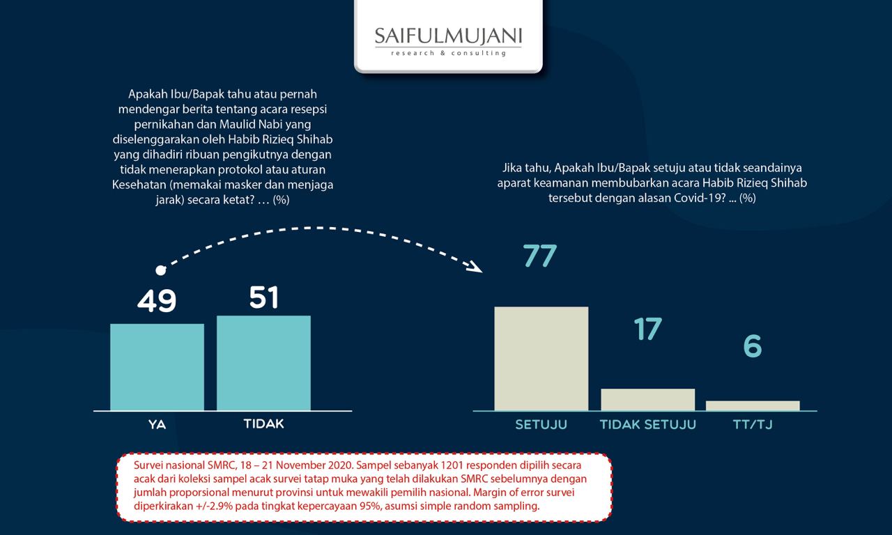 Survei nasional Saiful Mujani Research and Consulting (SMRC) menunjukkan bahwa pada umumnya warga memandang pemerintah layak bertindak tegas terhadap acara pernikahan putri Muhammad Rizieq Shihab (MRS) dan maulud Nabi yang dihadiri ribuan pengikut MRS dengan tidak menerapkan protokol kesehatan (memakai masker dan menjaga jarak) secara ketat.