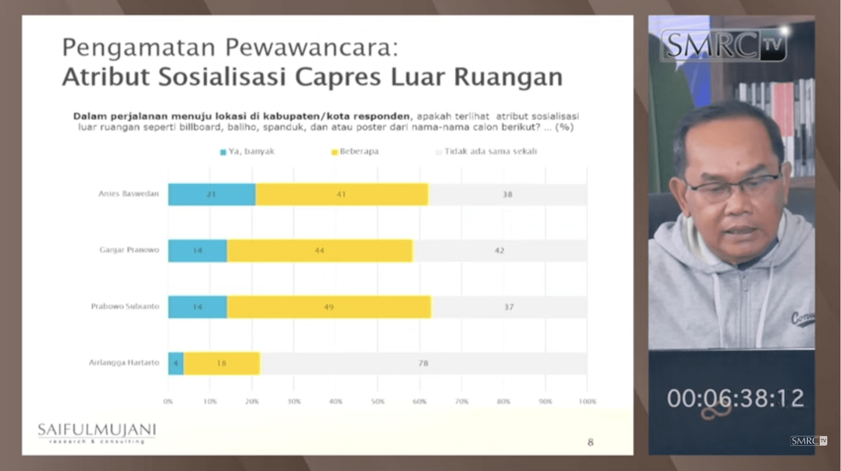 Pertanyaannya adalah bagaimana masyarakat pada lapisan bawah mengenal tokoh-tokoh tersebut? SMRC memiliki data observasi atau hasil pengamatan langsung pada atribut luar ruang, seperti spanduk, baliho, billdoard, poster, bendera, dan sebagainya. Saiful menyebut bahwa adalah umum terjadi di setiap Pemilu, atribut luar ruang peserta Pemilu ada di pelbagai tempat.