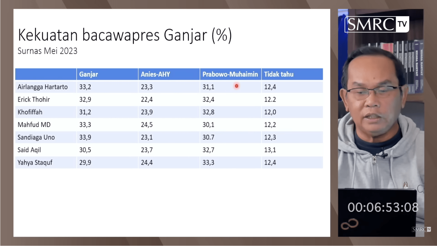 Dalam survei nasional SMRC pada Mei 2023, dilakukan simulasi beberapa tokoh yang kemungkinan menjadi bacawapres Ganjar. Saiful menjelaskan bahwa di antara nama-nama bakal calon presiden, Ganjar sekarang lebih definitif karena didukung satu partai (PDIP) yang bisa mengajukan calon sendiri. Prabowo, di survei cukup kompetitif, tapi belum definitif karena partai yang mendukungnya masih membutuhkan partai lain. Demikian juga Anies Baswedan. Karena itu dipertimbangkan siapa bakal calon wakil untuk Ganjar yang paling bisa membantu dia mengalahkan lawan-lawannya.
