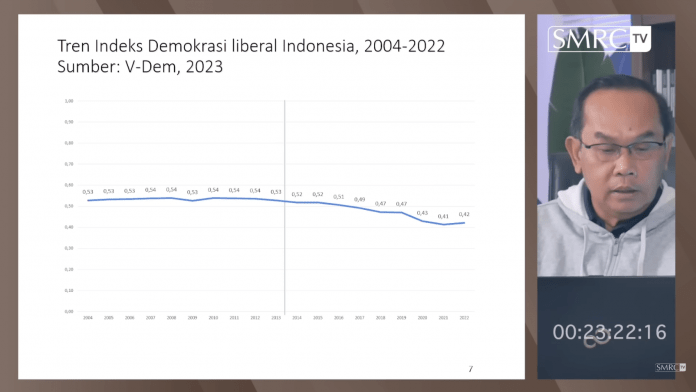 Dengan menggunakan ukuran equality before the law dan pengawasan terhadap eksekutif menurut V-Dem, Saiful menunjukkan gejala kemunduran demokrasi di Indonesia. Dalam skala 0 sampai 1, di mana 0 sangat buruk dan 1 sangat baik, kondisi demokrasi berdasarkan pengukuran tersebut di Indonesia sekarang (2022) ada di angka 0,42, perolehan ini mundur dibanding dengan 2004 yang mencapai 0,53. Diukur sejak penerapan sistem pemilihan presiden secara langsung 2004, kondisi demokrasi Indonesia mengalami kemunduran berdasarkan data V-Dem.