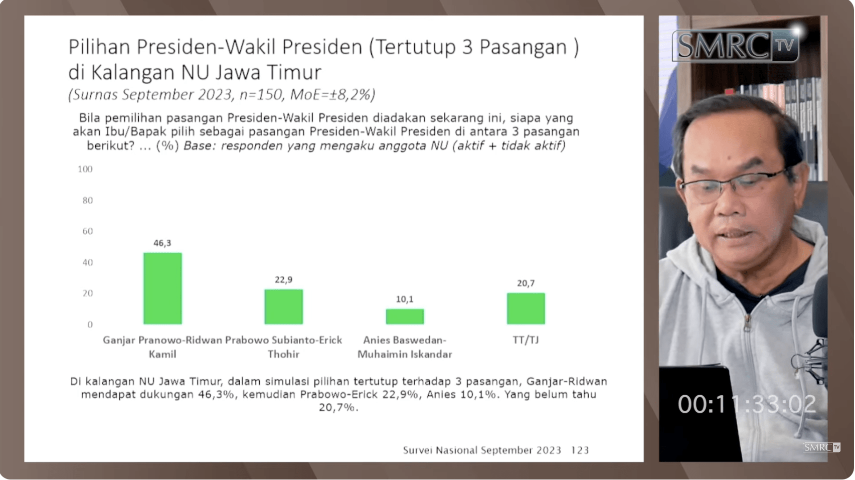 Elektabilitas pasangan Anies Baswedan – Muhaimin Iskandar di kalangan anggota Nahdlatul Ulama (NU) Jawa Timur mencapai 10,1 persen. Demikian temuan survei Saiful Mujani Research and Consulting (SMRC) yang dilakukan pada 2 sampai 11 September 2023. Temuan ini dipresentasikan pendiri SMRC, Prof. Saiful Mujani, dalam program ‘Bedah Politik bersama Saiful Mujani’ episode “Capres Pilihan Warga NU Jatim Pasca Deklarasi AMIN” yang disiarkan melalui kanal YouTube SMRC TV pada Kamis, 12 Oktober 2023.