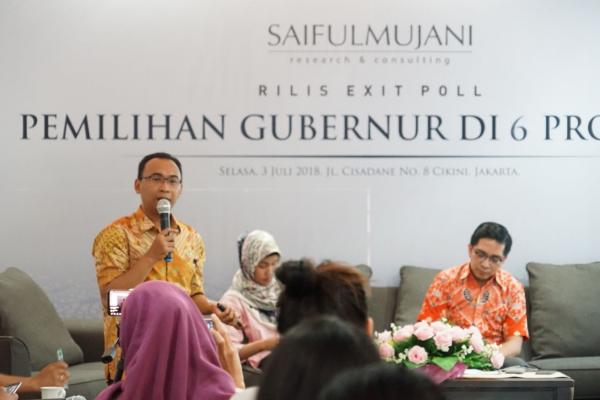 Hal ini disampaikan Direktur Riset Saiful Mujani Research and Consulting (SMRC), Deni Irvani di Jakarta (3/7) saat menyajikan hasil penelitian SMRC tentang exit poll pemilihan gubernur di 6 provinsi, yaitu Jawa Barat, Jawa Tengah, Jawa Timur, Sumatera Utara, Kalimantan Barat, dan Sulawesi Selatan.
