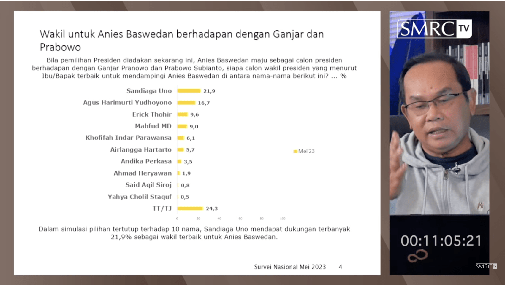 Demikian temuan survei nasional Saiful Mujani Research and Consulting (SMRC) pada Mei 2023. Temuan survei tersebut disampaikan Prof. Saiful Mujani dalam program ’Bedah Politik bersama Saiful Mujani’ episode “Bakal Calon Wakil Presiden Pilihan Publik” melalui kanal YouTube SMRC TV pada Kamis, 29 Juni 2023.