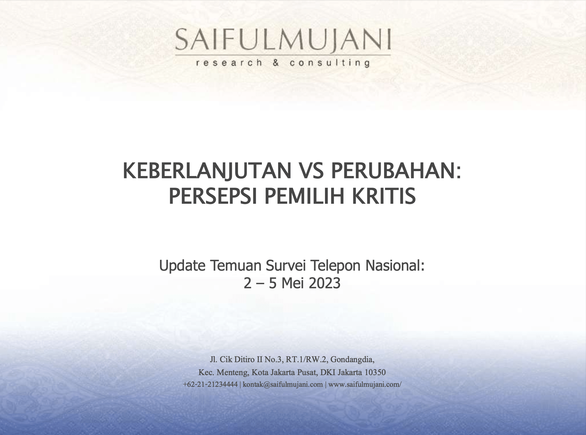Keberlanjutan vs Perubahan: Persepsi Pemilih Kritis Penulis Redaksi 9 Mei 2023 681 Bagikan FacebookTwitterPinterestWhatsApp Loading... Taking too long? Reload document | Open in new tab Download [620.23 KB] TagsAnies BaswedanGanjar PranowoNarasi Perubahan vs KeberlanjutanPilpres 2024Prabowo SubiantoPresiden JokowiProgram Pemerintahan Jokowi Bagikan FacebookTwitterPinterestWhatsApp Redaksihttp://saifulmujani.com RELATED ARTICLES post Demokrasi Presidensial dan Pilkada 30 Januari 2025 post Pasangan Pram-Rano Menyatukan Pendukung Ahok dan Anies 1 Desember 2024 Exit Poll Efek Endorsement dalam Pemilihan Gubernur Jakarta 2024 1 Desember 2024 Terbaru Demokrasi Presidensial dan Pilkada 30 Januari 2025 Pasangan Pram-Rano Menyatukan Pendukung Ahok dan Anies 1 Desember 2024 Efek Endorsement dalam Pemilihan Gubernur Jakarta 2024 1 Desember 2024 Press Release Quick Count Pemilihan Gubernur Jawa Tengah 2024 28 November 2024 SMRC TV Isu HAM dalam Debat Capres 115 Desember 2023