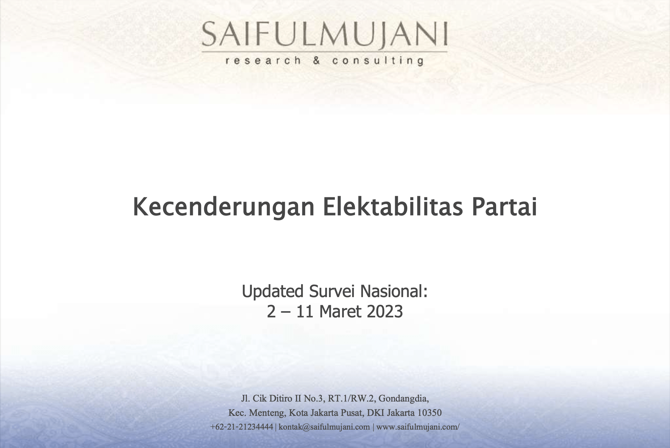 Kecenderungan Elektabilitas Partai Penulis Redaksi 20 Maret 2023 870 Bagikan FacebookTwitterPinterestWhatsApp Loading... Taking too long? Reload document | Open in new tab Download [339.48 KB] TagsElektabilitas PartaiGerindraGolkarPartai PolitikPDI PerjuanganPemilu 2019 Bagikan FacebookTwitterPinterestWhatsApp Redaksihttp://saifulmujani.com RELATED ARTICLES post Demokrasi Presidensial dan Pilkada 30 Januari 2025 post Pasangan Pram-Rano Menyatukan Pendukung Ahok dan Anies 1 Desember 2024 Exit Poll Efek Endorsement dalam Pemilihan Gubernur Jakarta 2024 1 Desember 2024 Terbaru Demokrasi Presidensial dan Pilkada 30 Januari 2025 Pasangan Pram-Rano Menyatukan Pendukung Ahok dan Anies 1 Desember 2024 Efek Endorsement dalam Pemilihan Gubernur Jakarta 2024 1 Desember 2024 Press Release Quick Count Pemilihan Gubernur Jawa Tengah 2024 28 November 2024 SMRC TV Isu HAM dalam Debat Capres 115 Desember 2023