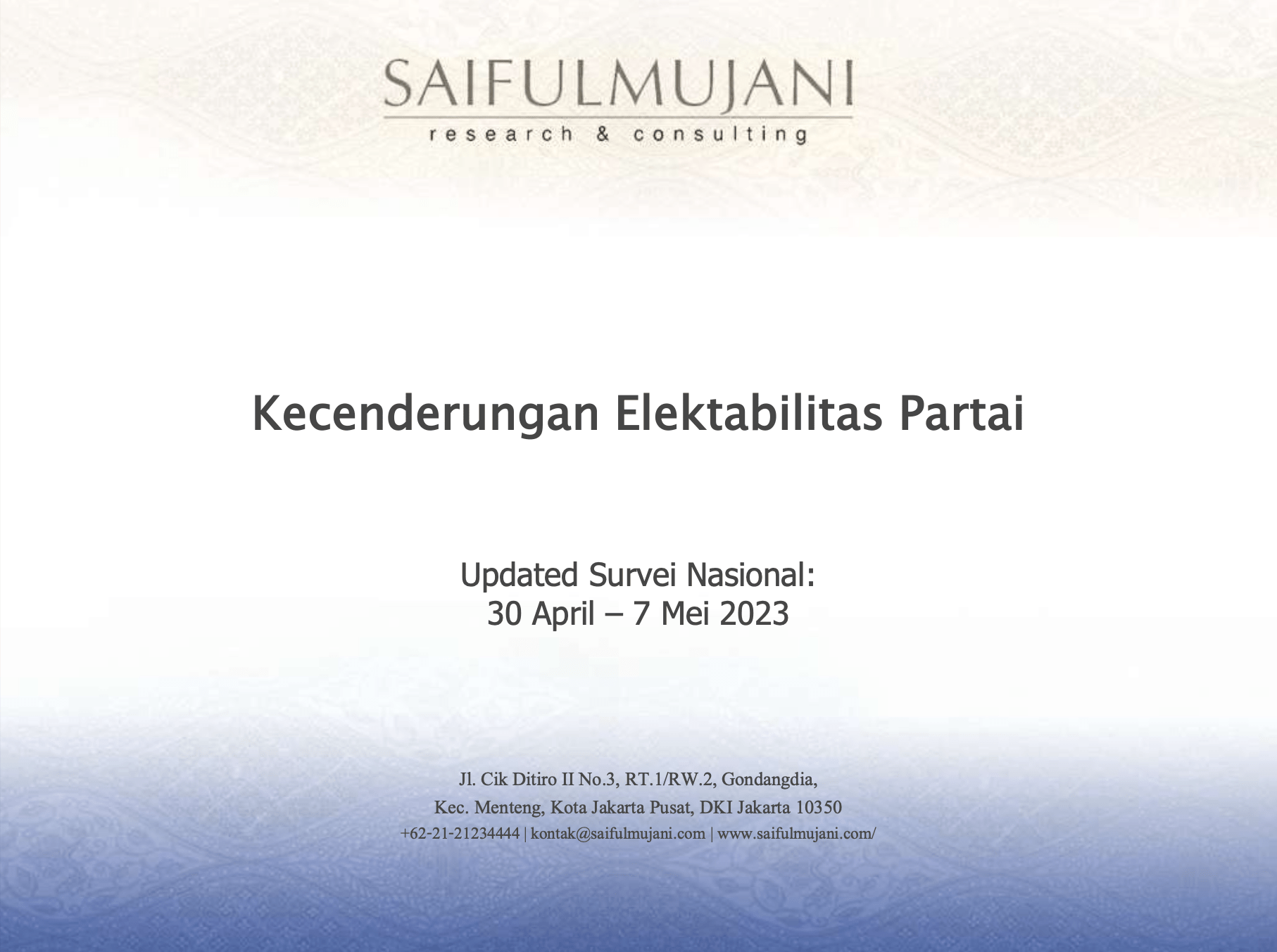 Kecenderungan Elektabilitas Partai: Survei Tatap Muka 30 April – 7 Mei 2023 Penulis Redaksi 16 Mei 2023 845 Bagikan FacebookTwitterPinterestWhatsApp Loading... Taking too long? Reload document | Open in new tab Download [309.39 KB] TagsElektabilitas PartaiGerindraGolkarPartai PolitikPDI PerjuanganPileg 2019Pileg 2024 Bagikan FacebookTwitterPinterestWhatsApp Redaksihttp://saifulmujani.com RELATED ARTICLES post Demokrasi Presidensial dan Pilkada 30 Januari 2025 post Pasangan Pram-Rano Menyatukan Pendukung Ahok dan Anies 1 Desember 2024 Exit Poll Efek Endorsement dalam Pemilihan Gubernur Jakarta 2024 1 Desember 2024 Terbaru Demokrasi Presidensial dan Pilkada 30 Januari 2025 Pasangan Pram-Rano Menyatukan Pendukung Ahok dan Anies 1 Desember 2024 Efek Endorsement dalam Pemilihan Gubernur Jakarta 2024 1 Desember 2024 Press Release Quick Count Pemilihan Gubernur Jawa Tengah 2024 28 November 2024 SMRC TV Isu HAM dalam Debat Capres 115 Desember 2023