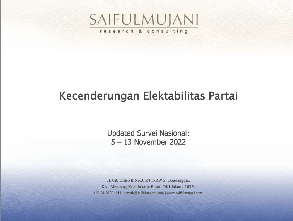 Kecenderungan Elektabilitas Partai Penulis Redaksi 23 November 2022 579 Bagikan FacebookTwitterPinterestWhatsApp Loading... Taking too long? Reload document | Open in new tab Download [327.37 KB] TagsElektabilitasPartai Politik Bagikan FacebookTwitterPinterestWhatsApp Redaksihttp://saifulmujani.com RELATED ARTICLES post Demokrasi Presidensial dan Pilkada 30 Januari 2025 post Pasangan Pram-Rano Menyatukan Pendukung Ahok dan Anies 1 Desember 2024 Exit Poll Efek Endorsement dalam Pemilihan Gubernur Jakarta 2024 1 Desember 2024 Terbaru Demokrasi Presidensial dan Pilkada 30 Januari 2025 Pasangan Pram-Rano Menyatukan Pendukung Ahok dan Anies 1 Desember 2024 Efek Endorsement dalam Pemilihan Gubernur Jakarta 2024 1 Desember 2024 Press Release Quick Count Pemilihan Gubernur Jawa Tengah 2024 28 November 2024 SMRC TV Isu HAM dalam Debat Capres 115 Desember 2023