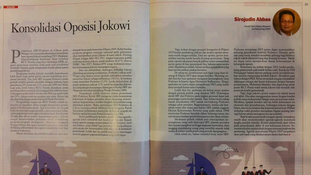 Meski demikian, konsolidasi koalisi ini akan berdampak besar pada konstelasi Pilpres 2019. Keberhasilan program-program strategis nasional pada gilirannya akan memperkuat posisi Jokowi di mata rakyat. Penting diingat, hingga akhir Mei 2017, tingkat kepuasan publik terhadap kinerja Jokowi masih berkisar di 67 persen (Survei SMRC, Mei 2017). Bahkan 69 persen warga Indonesia meyakini kemampuan Jokowi memimpin negara.