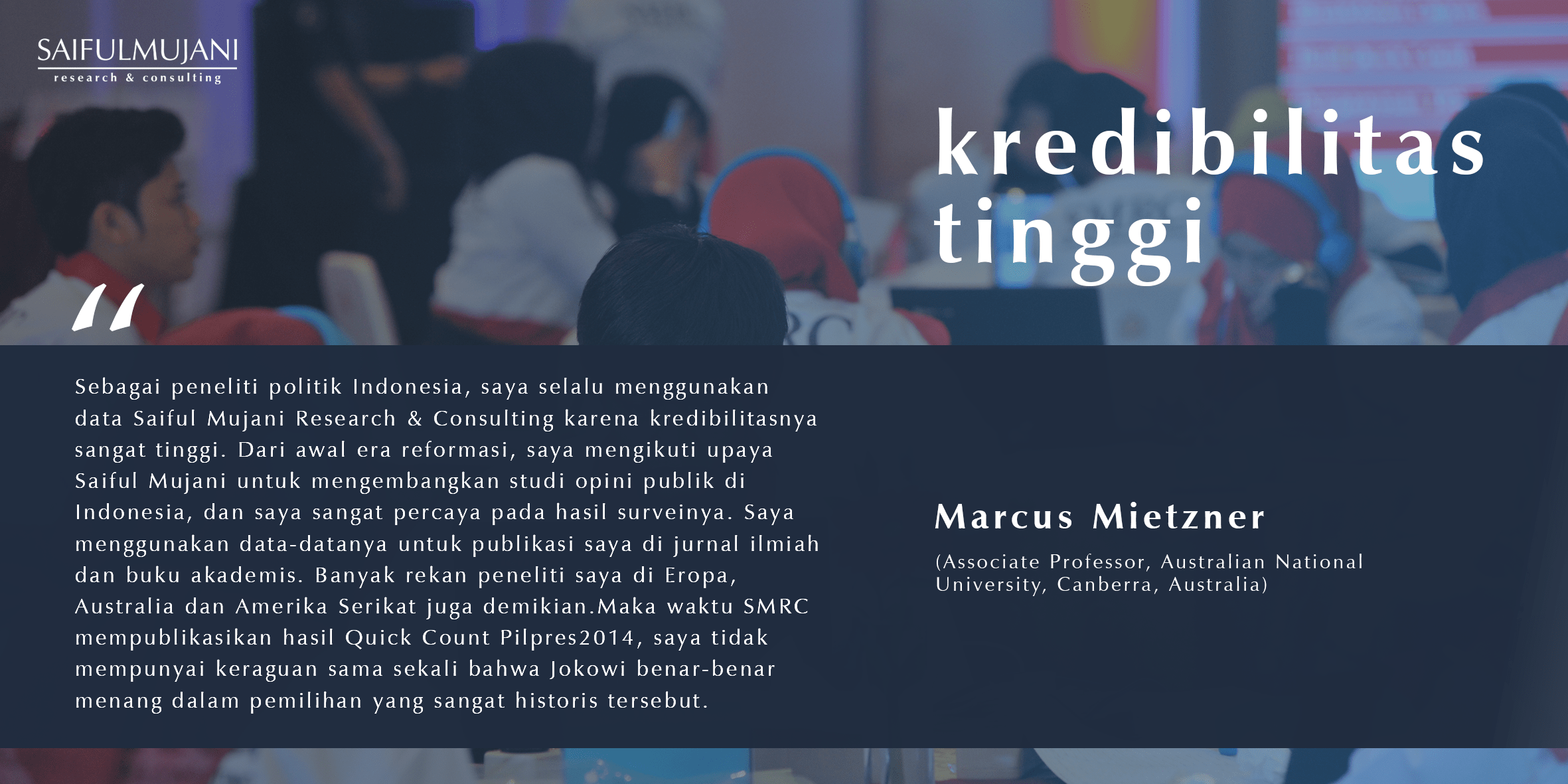 Marcus Mietzner: Percaya SMRC karena Kredibilitas Penulis admin 20 November 2019 2666 Bagikan FacebookTwitterPinterestWhatsApp Jakarta, Indonesia July 15, 2014 JFCC Panel Discussion on Post Election Outlook. Speakers: Philips J. Vermonte (CSIS), Marcus Mietzner (Senior Lecturer Australia National University/ANU), Kevin Evans (Pemilu.Asia) Photo by Toto Santiko Budi TagsDemokrasi Bagikan FacebookTwitterPinterestWhatsApp admin RELATED ARTICLES Testimonial Thomas Pepinsky: SMRC Professional and Non-partisan 22 November 2019 Testimonial R William Liddle: Gold Standard of Polling Firm 21 November 2019 Terbaru Demokrasi Presidensial dan Pilkada 30 Januari 2025 Pasangan Pram-Rano Menyatukan Pendukung Ahok dan Anies 1 Desember 2024 Efek Endorsement dalam Pemilihan Gubernur Jakarta 2024 1 Desember 2024 Press Release Quick Count Pemilihan Gubernur Jawa Tengah 2024 28 November 2024 SMRC TV Isu HAM dalam Debat Capres 115 Desember 2023