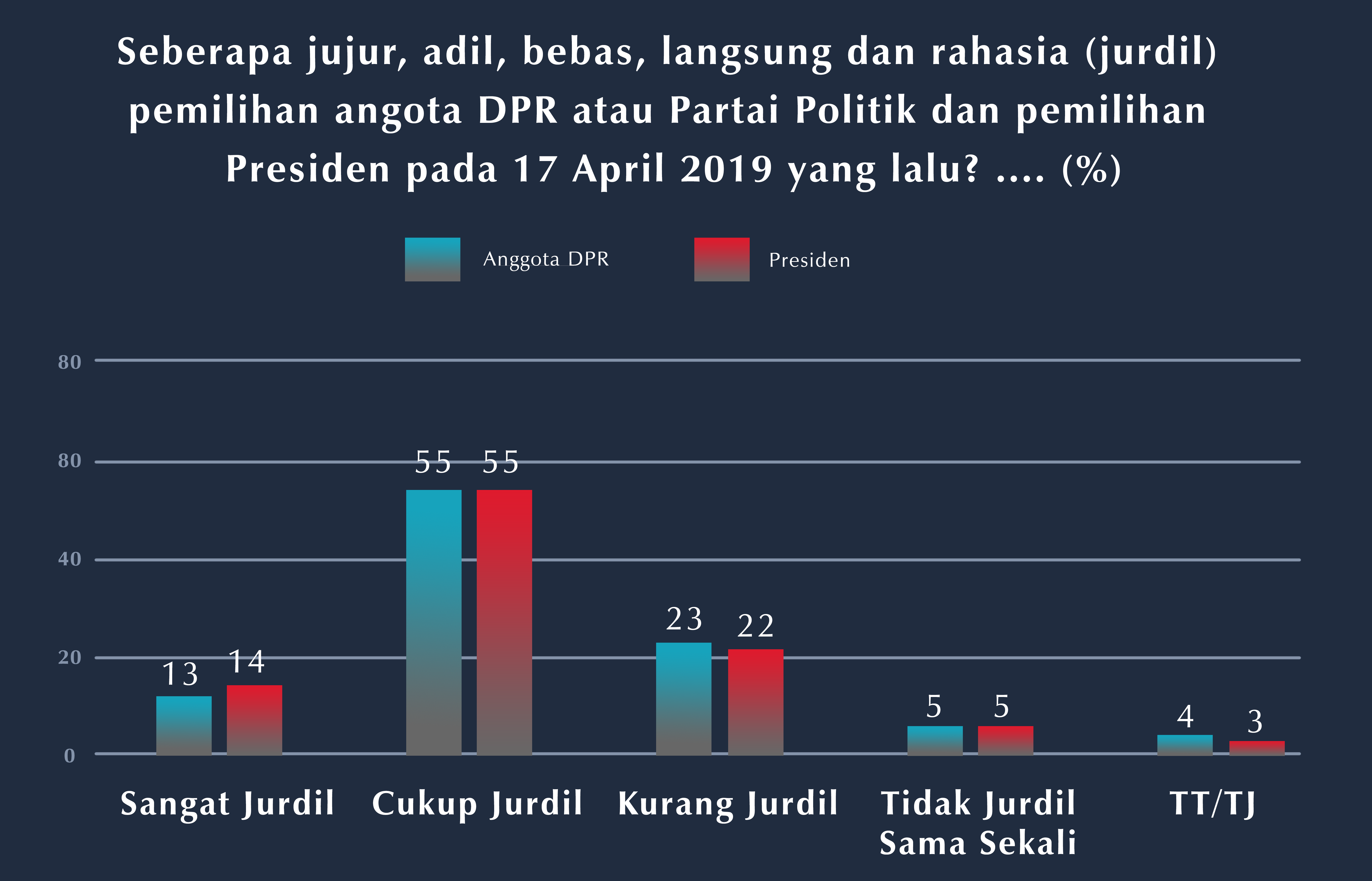 Survei Saiful Mujani Research and Consulting (SMRC) terbaru menunjukkan mayoritas rakyat Indonesia percaya bahwa pemilihan Presiden dan anggota DPR pada 17 April 2019 berlangsung secara jujur, adil, bebas, langsung, dan rahasia. Yang menganggap pemilu berlangsung jurdil mencapai 68-69% warga, sementara yang menganggap kurang/tidak jurdil hanya 27-28%.