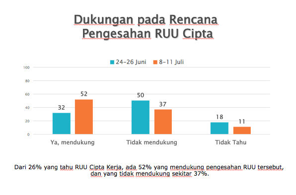 Mayoritas warga Indonesia yang mengetahui RUU Cipta Kerja saat ini mendukung pengesahan RUU tersebut pada Agustus 2020. Sekitar 52% menyatakan mendukung pengesahan RUU Cipta kerja pada Agustus 2020, sementara yang tidak mendukung 37%.