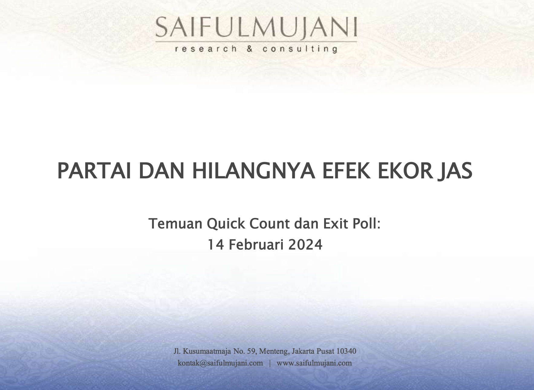 Pemilihan umum telah dilakukan pada 14 Februari 2024 lalu. Partai apa saja yang kemungkinan lolos ke senayan? Apakah ada efek ekor jas dalam pemilu tersebut? Â Bagaimana pula efek Jokowi terhadap suara partai-partai politik? Untuk menjawab pertanyaan-pertanyaan tersebut, SMRC melakukan quick count dan exit poll ketika pemilu berlangsung pada hari-H.