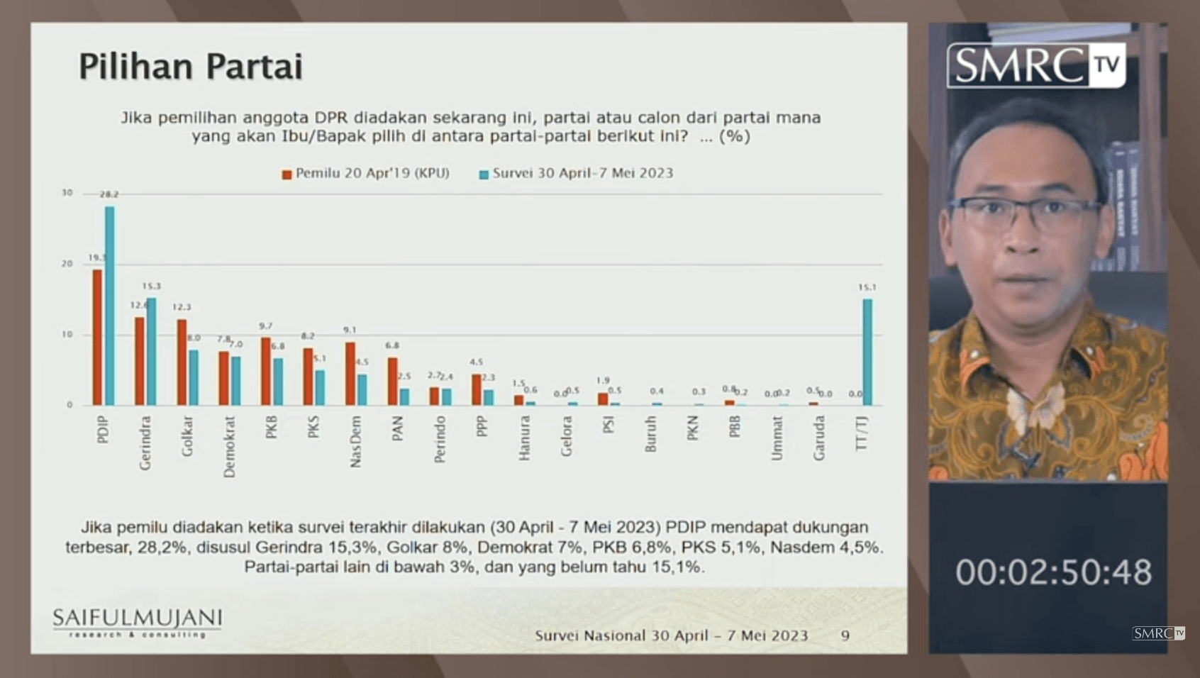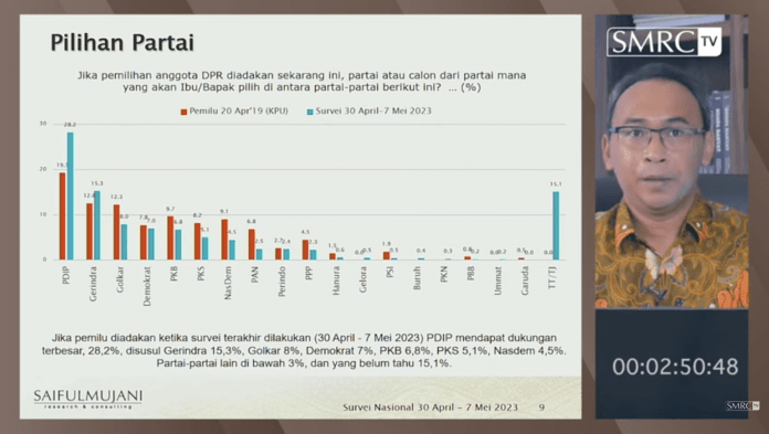 Demikian temuan survei nasional Saiful Mujani Research and Consulting (SMRC) bertajuk “Elektabilitas Partai-partai Pasca Deklarasi Capres PDIP”. Hasil survei yang dilakukan secara tatap muka pada 30 April – 7 Mei 2023 ini dipresentasikan Direktur Riset SMRC, Deni Irvani, dan disiarkan melalui kanal YouTube SMRC TV pada Selasa, 16 Mei 2023.