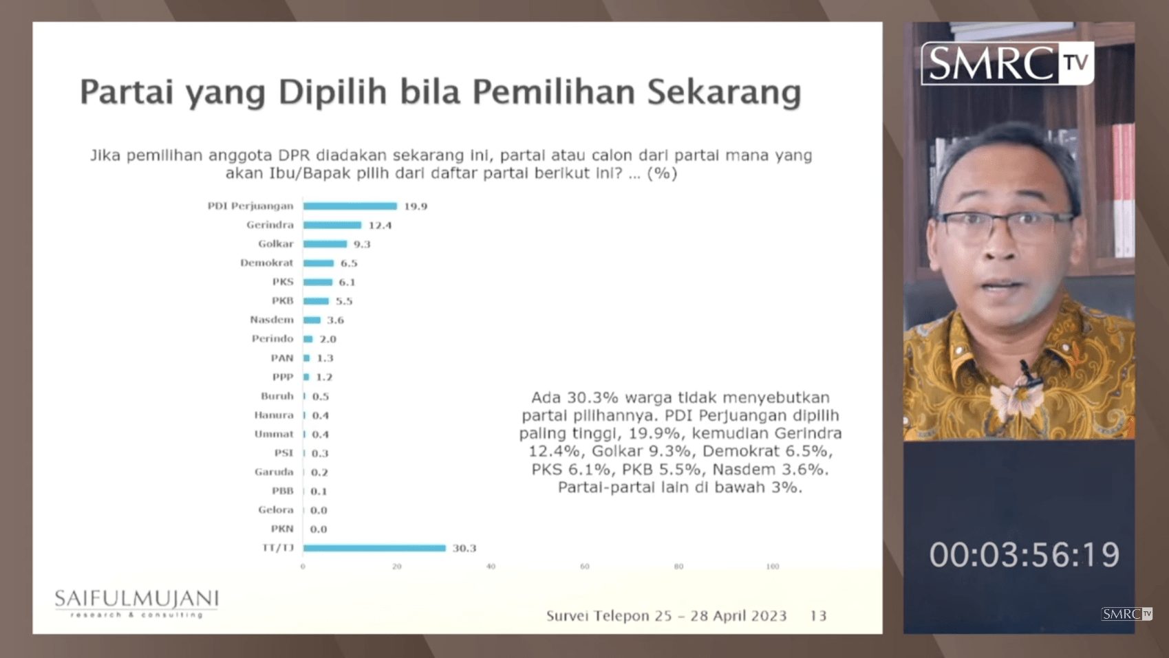 Dalam presentasinya, Deni menunjukkan bahwa dalam survei pada pemilih kritis, 25-28 April 2023, PDIP mendapat dukungan paling tinggi, 19,9 persen; selanjutnya Gerindra 12,4 persen; Golkar 9,3 persen; Demokrat 6,5 persen; PKS 6.1 persen; PKB 5,5 persen; dan Nasdem 3,6 persen. Sementara partai-partai lain mendapat dukungan di bawah 3 persen. Masih ada 30,3 persen yang belum menentukan pilihan.