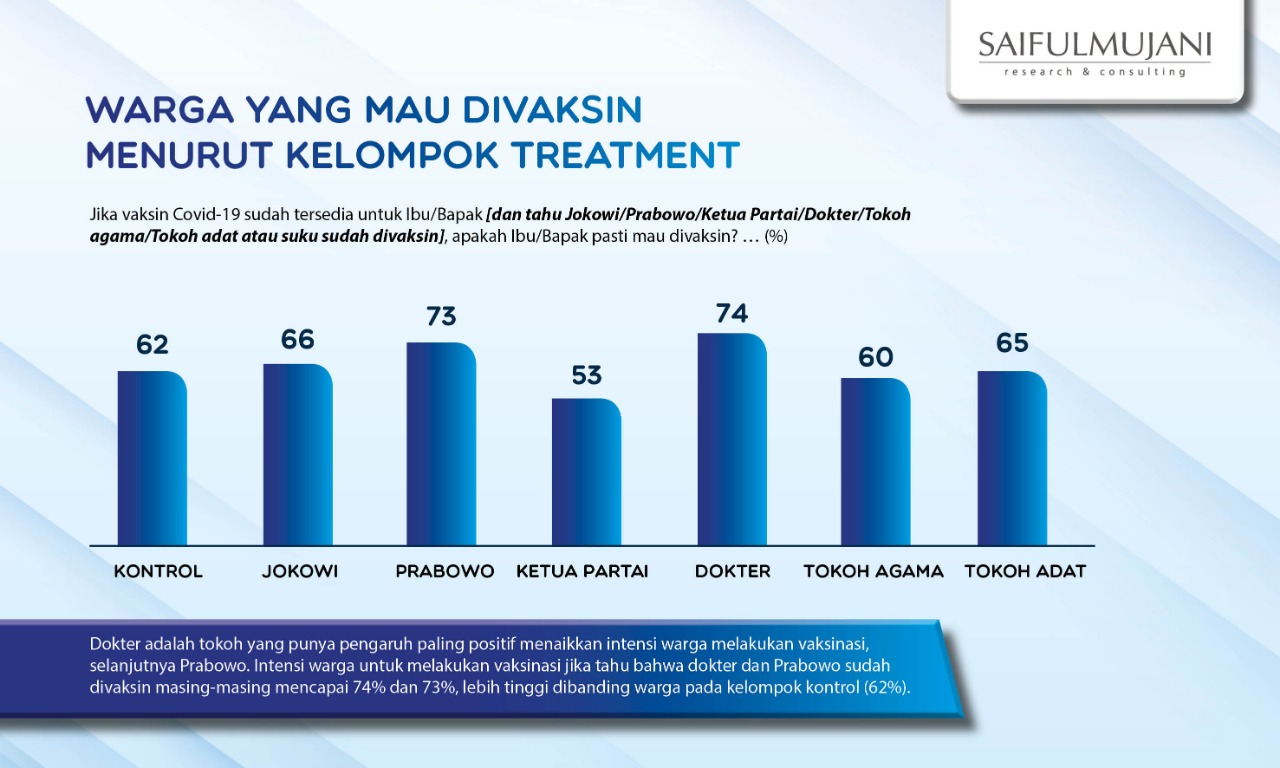 Survei eksperimen Saiful Mujani Research and Consulting (SMRC) menemukan bahwa Prabowo Subianto dan sosok dokter dapat menjadi faktor penting untuk meningkatkan kesediaan masyarakat menerima vaksinasi COVID-19.