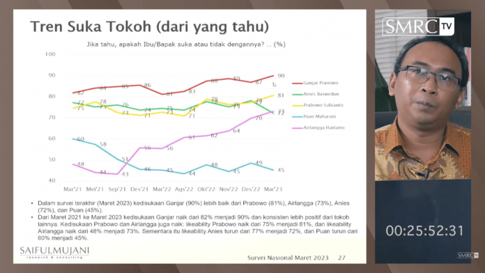 Demikian hasil survei terbaru SMRC yang dipresentasikan Direktur Riset SMRC, Deni Irvani, bertajuk “Trend Dukungan Calon Presiden” yang disiarkan melalui kanal YouTube SMRC TV pada Selasa, 21 Maret 2023.