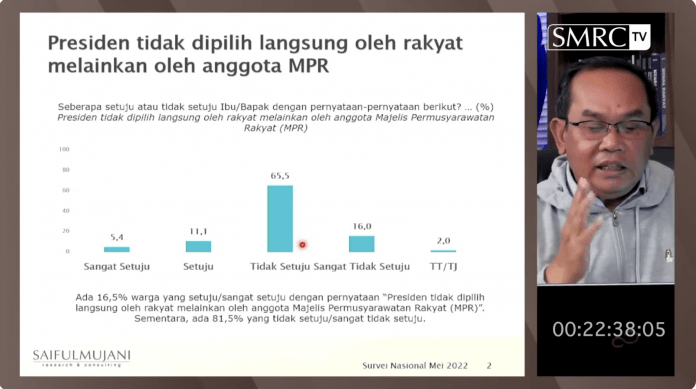 Saiful menjelaskan bahwa salah satu implikasi utama dalam konsep MPR sebagai lembaga tertinggi negara adalah bahwa lembaga inilah yang punya hak untuk memilih presiden. Survei SMRC pada Mei 2022 menunjukkan yang setuju dengan gagasan presiden tidak dipilih langsung oleh rakyat melainkan oleh MPR hanya sekitar 16,5 persen. Yang tidak atau sangat tidak setuju dengan gagasan tersebut 81,5 persen. Masih ada 2 persen yang belum menjawab.