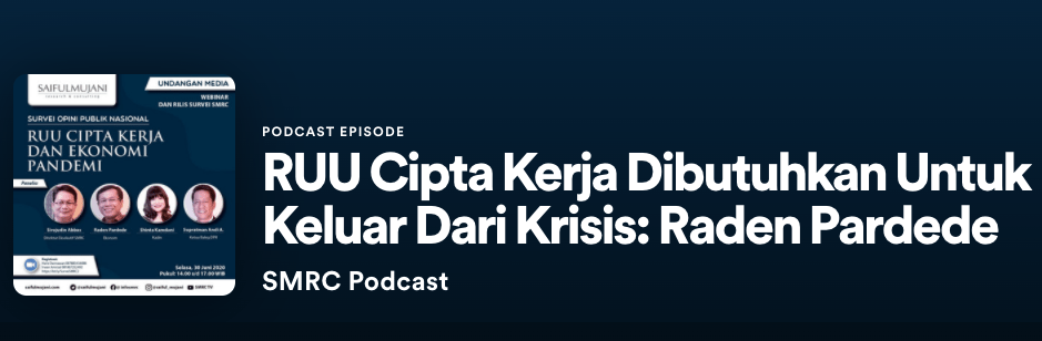 RUU Cipta Kerja Dibutuhkan Untuk Keluar Dari Krisis: Raden Pardede Penulis Redaksi 26 Juli 2020 1114 Bagikan FacebookTwitterPinterestWhatsApp Bagikan FacebookTwitterPinterestWhatsApp Redaksihttp://saifulmujani.com RELATED ARTICLES spotify Pemerintah dan DPR Perlu Tingkatkan Sosialisasi RUU Cipta Kerja; Nihayatul Wafiroh 27 Juli 2020 spotify Dunia Usaha Perlu Stimulus Untuk Keluar Dari Krisis: Rosan Roeslani 26 Juli 2020 spotify RUU Cipta Kerja Untuk Menyederhanakan Dan Memudahkan: Supratman Andi Atgas 25 Juli 2020 Terbaru Demokrasi Presidensial dan Pilkada 30 Januari 2025 Pasangan Pram-Rano Menyatukan Pendukung Ahok dan Anies 1 Desember 2024 Efek Endorsement dalam Pemilihan Gubernur Jakarta 2024 1 Desember 2024 Press Release Quick Count Pemilihan Gubernur Jawa Tengah 2024 28 November 2024 SMRC TV Isu HAM dalam Debat Capres 115 Desember 2023