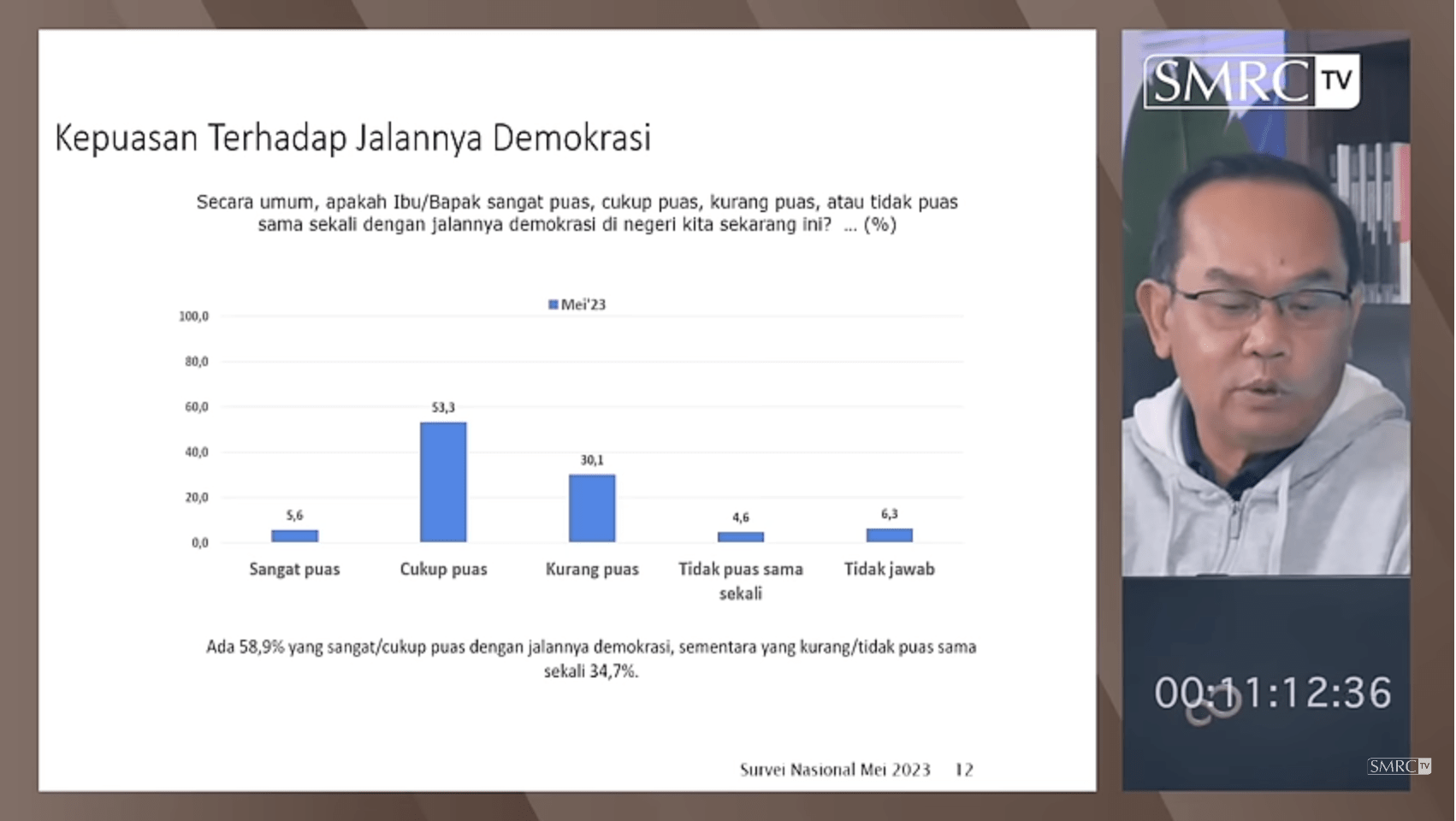 Dalam survei Saiful Mujani Research and Consulting (SMRC) pada Mei 2023, ada 11,1 persen yang memilih pandangan bahwa apa pun sistem pemerintahan yang kita anut, demokrasi atau pun otoritarianisme, tidak ada bedanya. Ada 10,6 persen yang memilih pandangan bahwa dalam keadaan tertentu, sistem pemerintahan bukan demokrasi atau otoritarianisme bisa diterima untuk negara kita. Sebanyak 70,4 persen yang setuju dengan pandangan bahwa walaupun tidak sempurna, demokrasi adalah sistem pemerintahan terbaik untuk negara kita. Masih ada 7,9 persen yang belum menjawab.