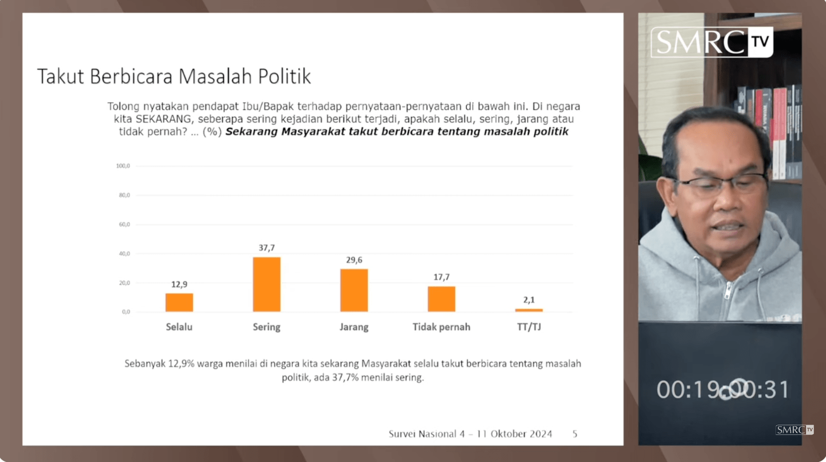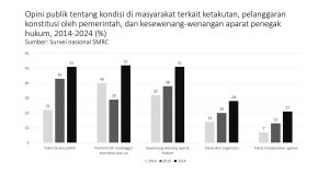 Sepuluh tahun pemerintahan Joko Widodo (2014-2024), 52 persen warga nilai pemerintah sering melanggar konstitusi atau perundang-undangan dan 51 persen merasa semakin banyak warga yang takut bicara politik. Demikian temuan survei Saiful Mujani Research and Consulting (SMRC), Oktober 2024. Hasil survei tersebut disampaikan pendiri SMRC, Prof. Saiful Mujani, dalam program Bedah Politik di kanal Youtube SMRC TV pada Senin, 15 Oktober 2024.