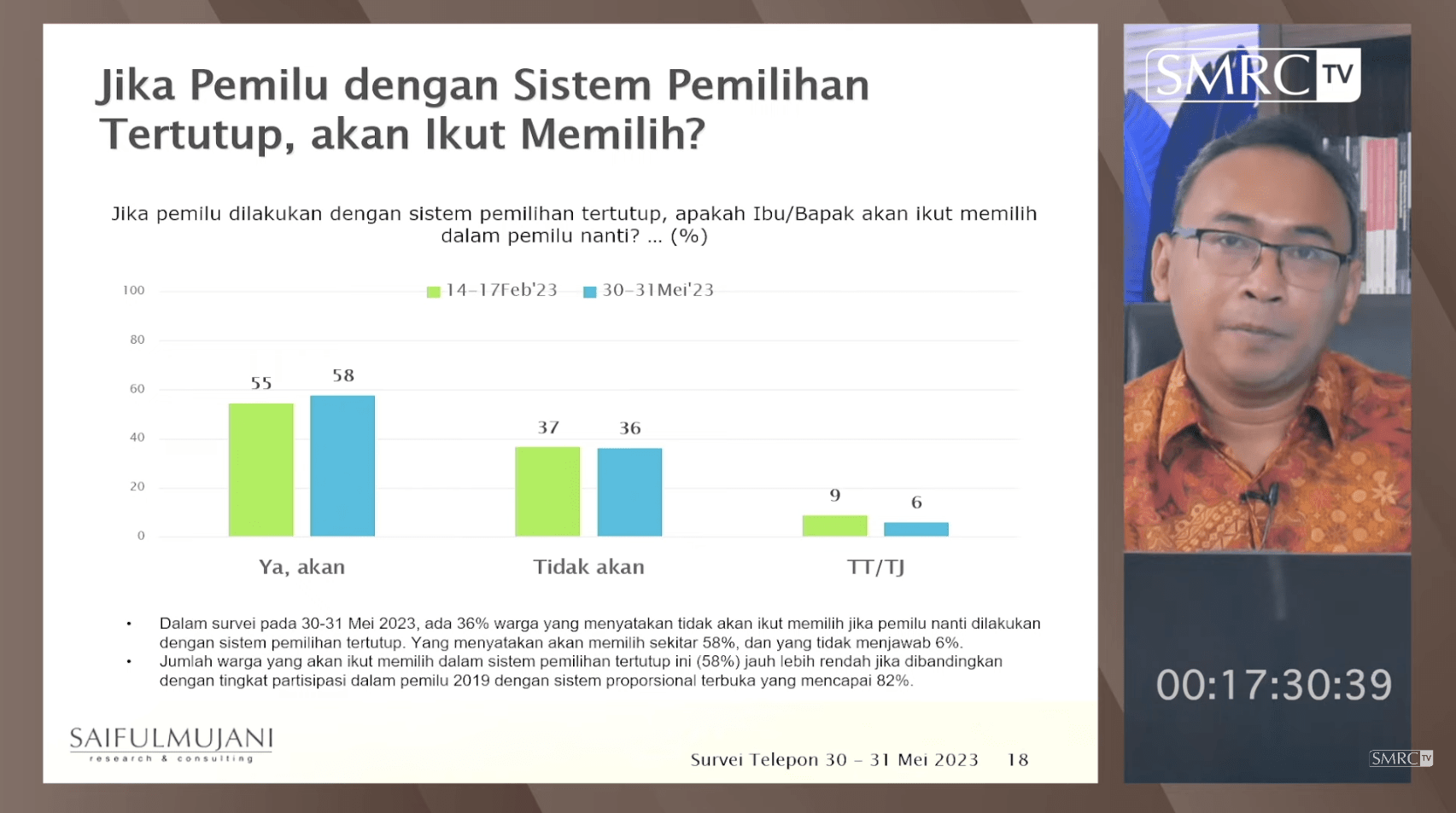 Deni menunjukkan jika pemilu 2024 nanti dilakukan dengan sistem pemilihan tertutup, hanya 58 persen warga yang menyatakan akan ikut memilih. Sementara yang menyatakan tidak akan ikut memilih sebesar 36 persen. Masih ada 6 persen yang tidak menjawab.