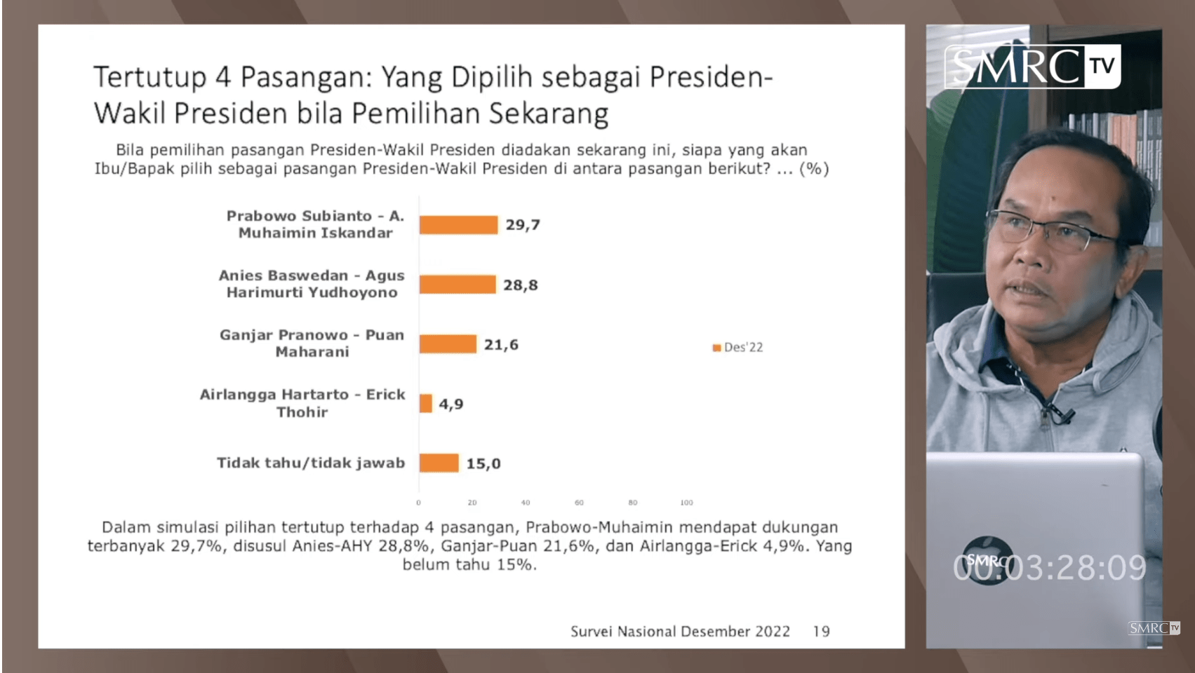 Dalam studi ini, dilakukan simulasi dengan asumsi ada empat pasangan dalam pemilihan presiden. Pertama adalah Prabowo Subianto sudah banyak didiskusikan. Ada upaya Gerindra berkoalisi dengan PKB untuk mengusung pasangan Prabowo dengan Muhaimin Iskandar. Kedua, Anies Baswedan dengan Agus Harimurti Yudhoyono (AHY) . Ketiga, Ganjar berpasangan dengan Puan. Keempat, Airlangga Hartarto akan mencari calon, misalnya Erick Thohir sebagai orang yang juga melakukan sosialisasi untuk calon presiden maupun calon wakil presiden.