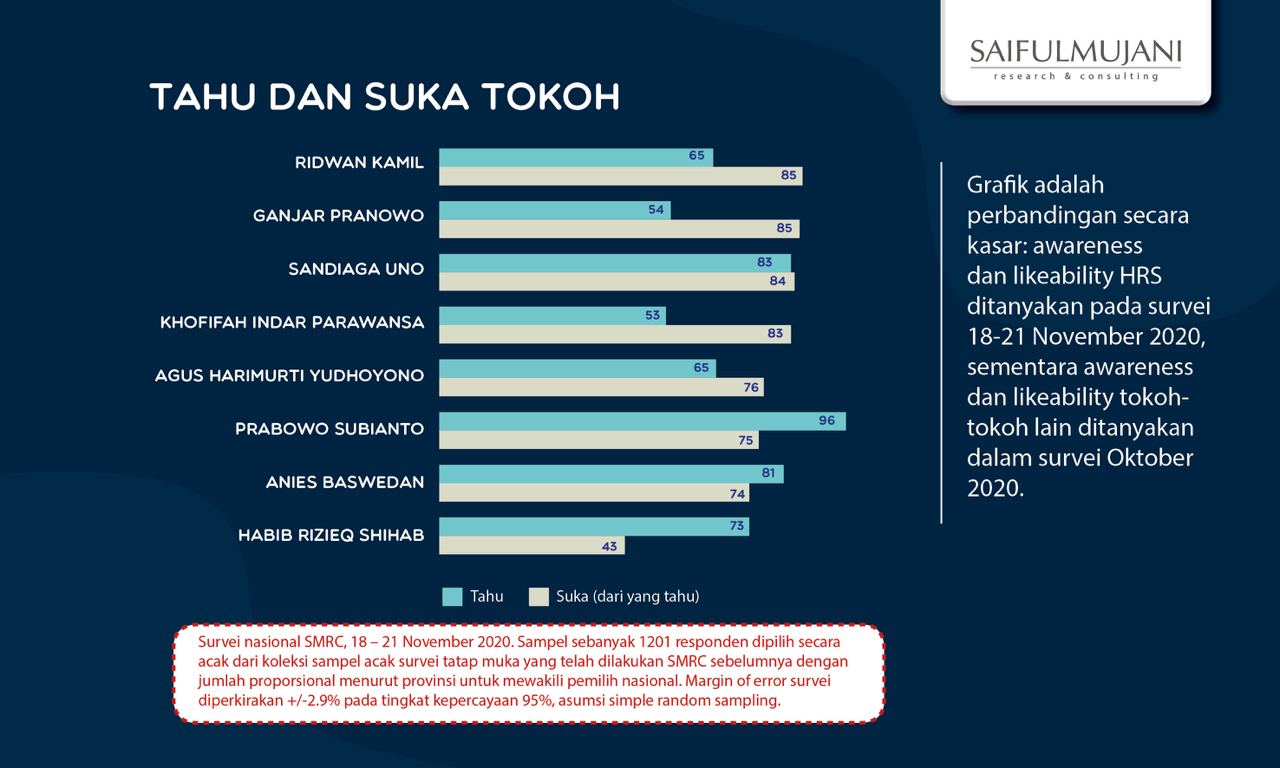 Survei SMRC pada Oktober 2020 menunjukkan empat orang tokoh yang tingkat kedisukaaannya paling tinggi dan mencapai di atas 80% adalah: Ridwan Kamil (85%), Ganjar Pranowo (85%), Sandiaga Uno (84%), dan Khofifah Indar Parawansa (83%). Kemudian ada Agus Harimurti Yudhoyono (76%), Prabowo Subianto (75%), dan Anies Baswedan (74%) di lapisan kedua.